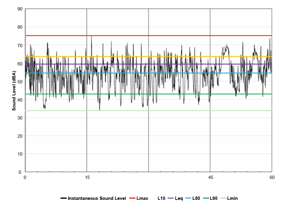 Environmental sound spans a wide range. The example below is from a mid-afternoon measurement in a rural area, near a moderately busy two-lane road. The figure below compares the second-by-second sound levels to the hourly statistical metrics, including Lmax, L10, Leq, L50, L90, and Lmin. The difference between the minimum (34 dBA) and maximum (75 dBA) sound levels observed is over 40 decibels. The average (Leq) in this case is 59 dBA, which is above the median (L50) of 55 dBA and L90 of 43 dBA. The dramatic differences between these various metrics in a single hour of data demonstrate the importance of identifying a quantitative definition of the ambient sound level. Defining “typical” sound is therefore difficult for regulators, and the challenge only increases when considering hourly, daily, or seasonal variability.